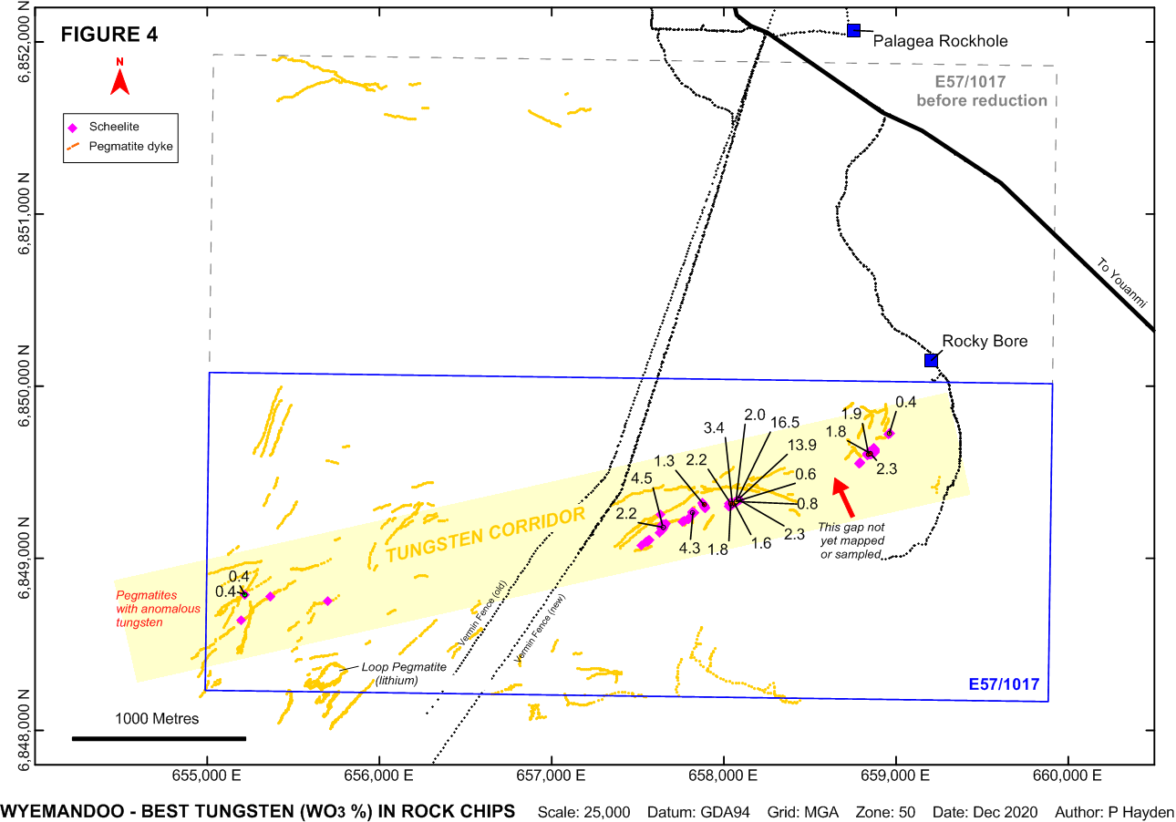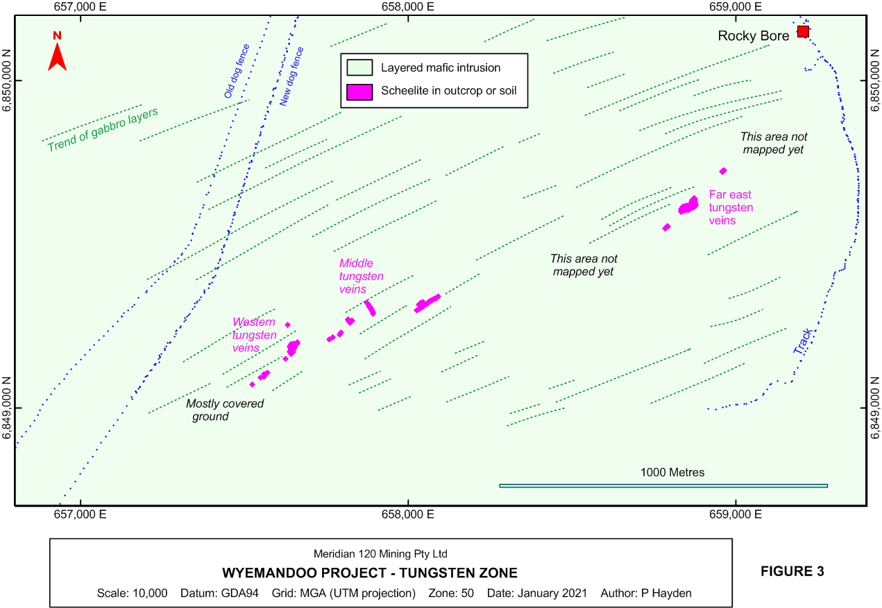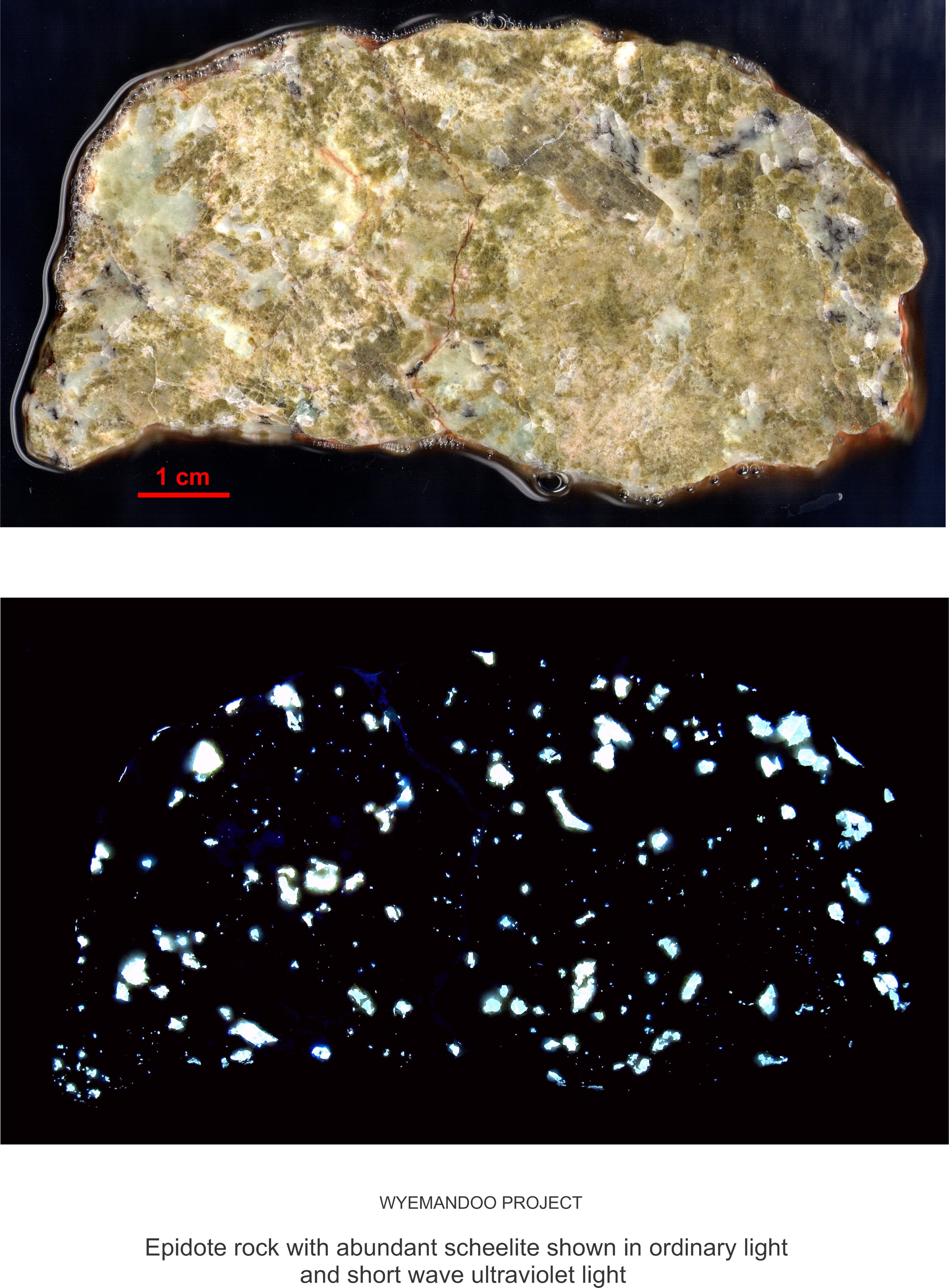 - High grade tungsten (scheelite) mineralisation is scattered along a 1600 metre length of an epidote-altered structural zone within a layered mafic intrusion